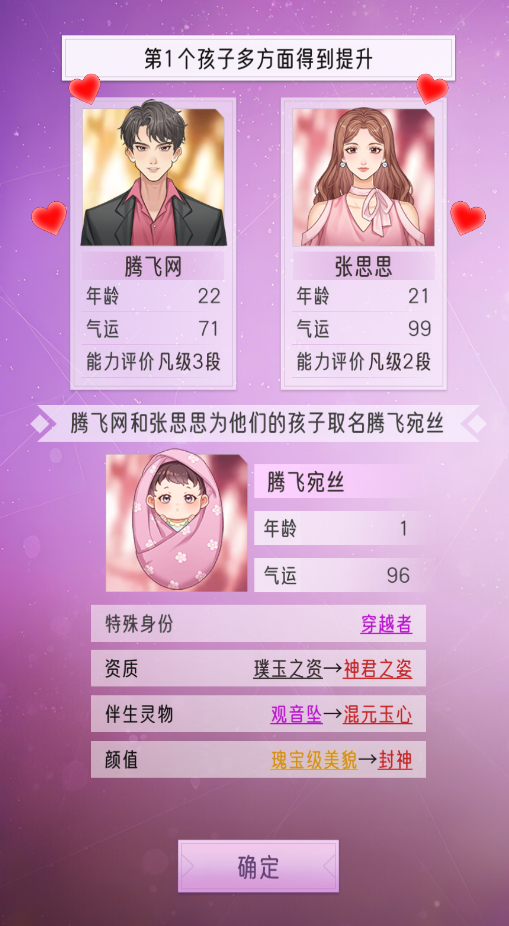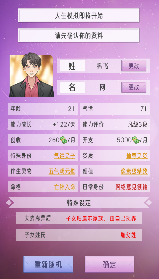 进入游戏后,首先创建角色:设定姓名、年龄、气运、能力成长倾向等基础属性,并可选择特殊身份(如“皇商之后”“隐世望族”)与天赋资质。确认后点击【确定】,正式开启你的豪门崛起之路——目标:建立顶级世家,称霸上京,铸就百年荣光。