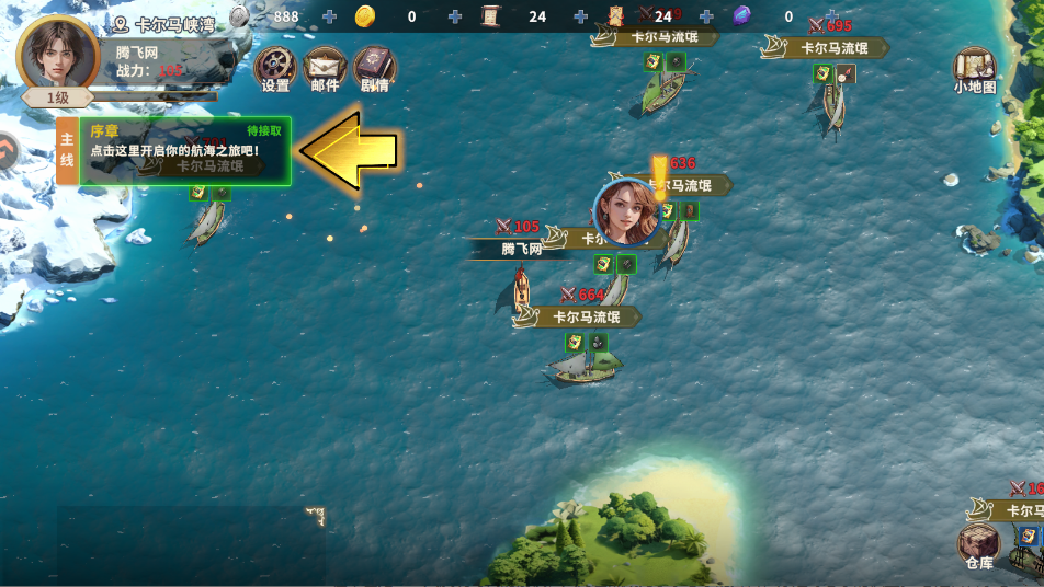1、进入大航海征途手游后,我们先跟着剧情来做任务;