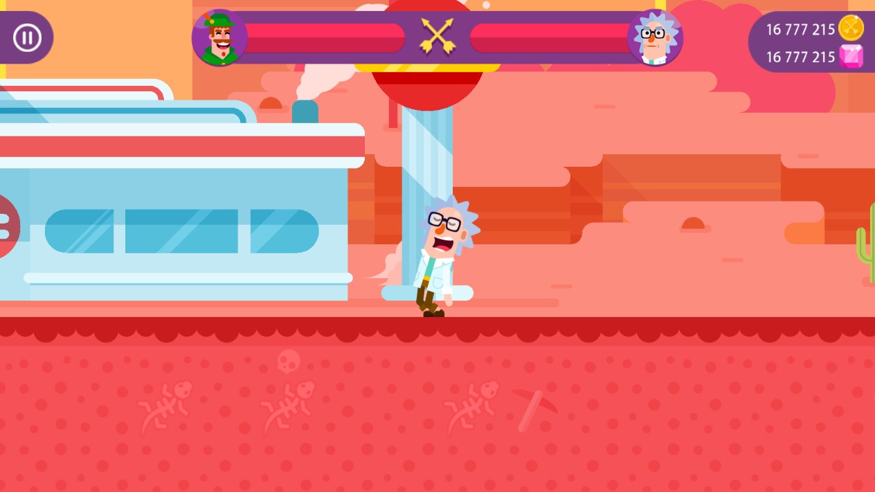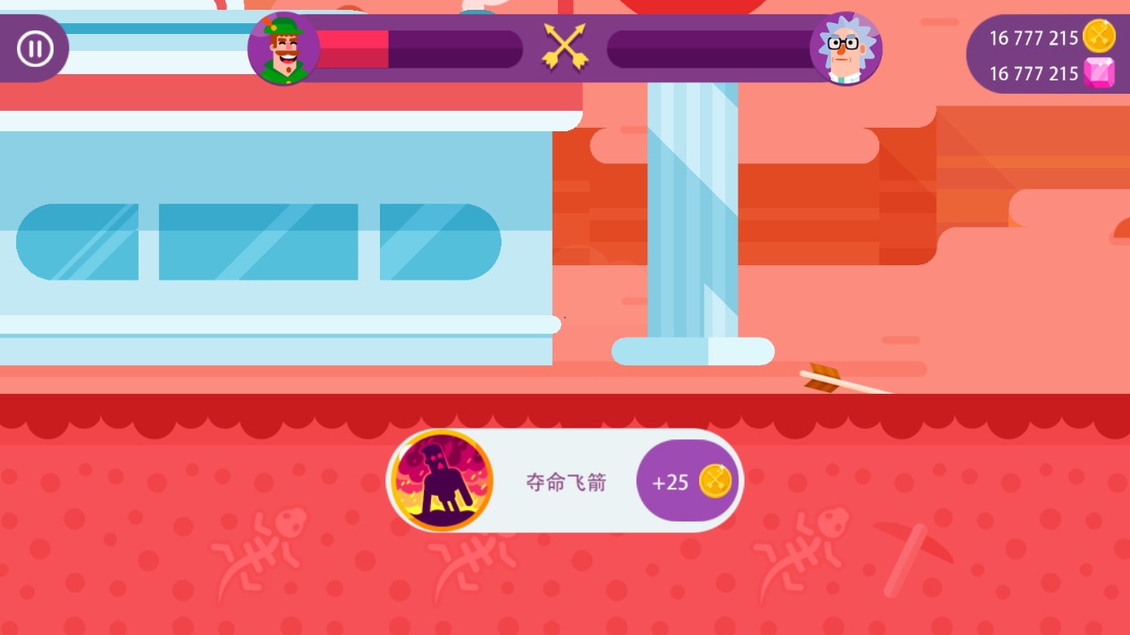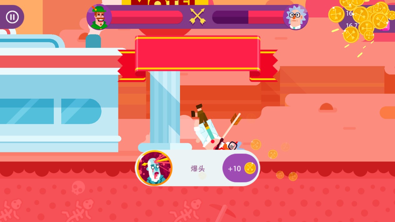 实际上游戏中的操作并不难,玩家只需要点击屏幕可以调整手中角色的射击角度和力度,只要在出手之前看好敌人方位然后据此行动即可。而在最基础的敌我互射模式中赢下足够场次,才能解锁更多的新玩法模式,比如打猎野鸭和射苹果大挑战,或者支持两位玩家PK的双人对战模式等。如果想要锻炼自己的射击技巧,也可以选择无尽模式。在该作之中玩家可以使用的角色并非只有初始那位希腊武士造型的胡子叔叔,还可以通过各种方式去入手其他新角色(共30位),里面甚至有某几位的造型能力是源自知名美漫和影视剧集,显得十分亲切。并且每位角色都有各自擅长的攻击方式,其中有部分甚至还可以在武器射出后进行二段式攻击操作,在出其不意的同时也能给予敌人更大伤害。