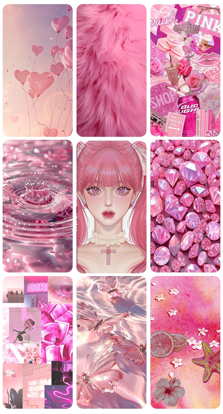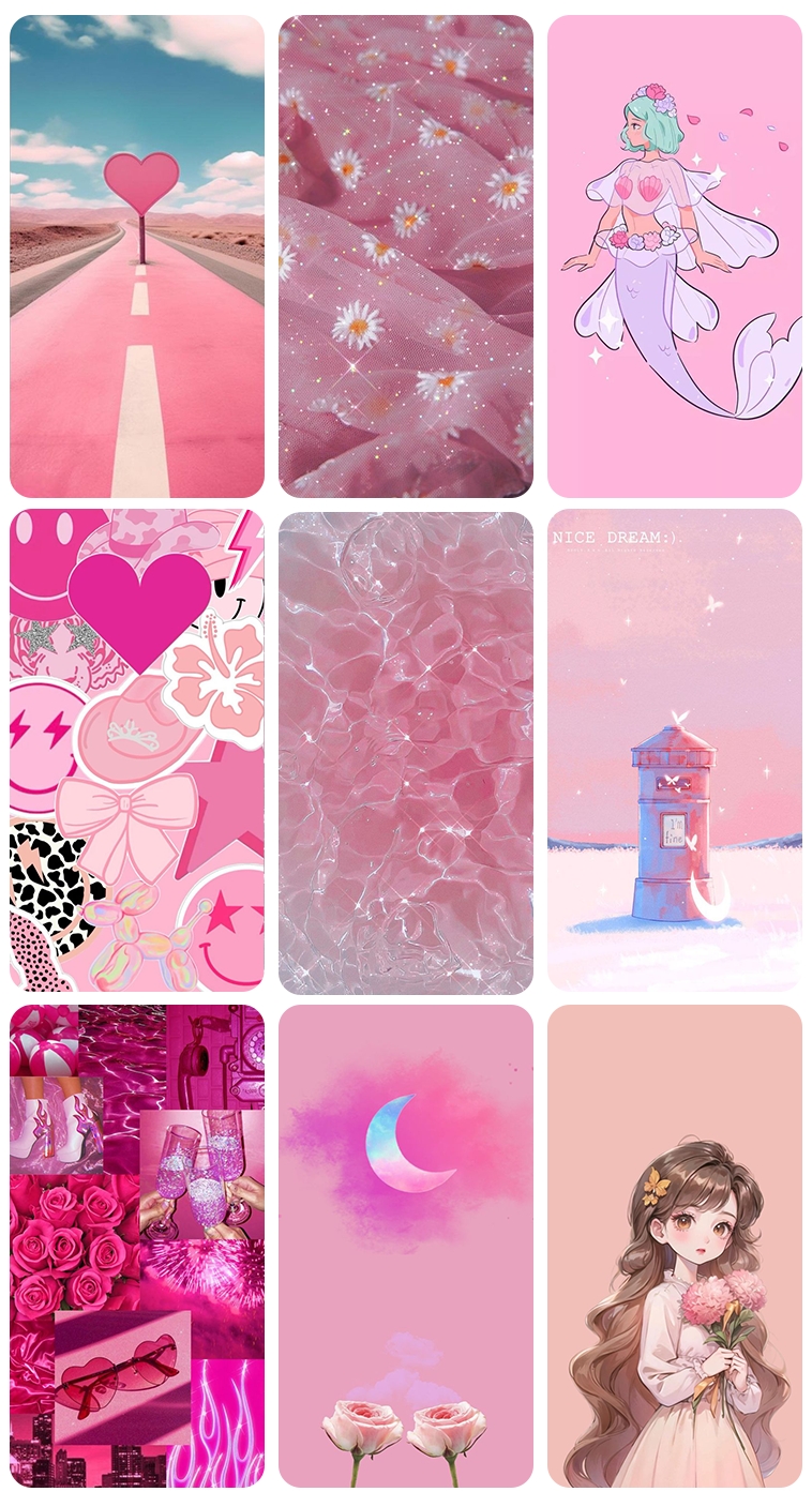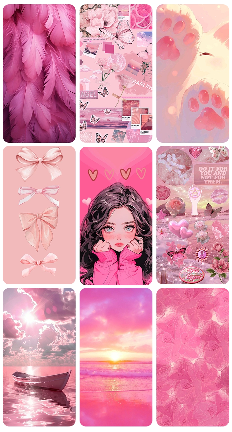壁纸种类丰富:除了纯色粉色,还有各种粉色渐变、粉色搭配其他颜色的组合,以及粉色元素的插画、动漫等。