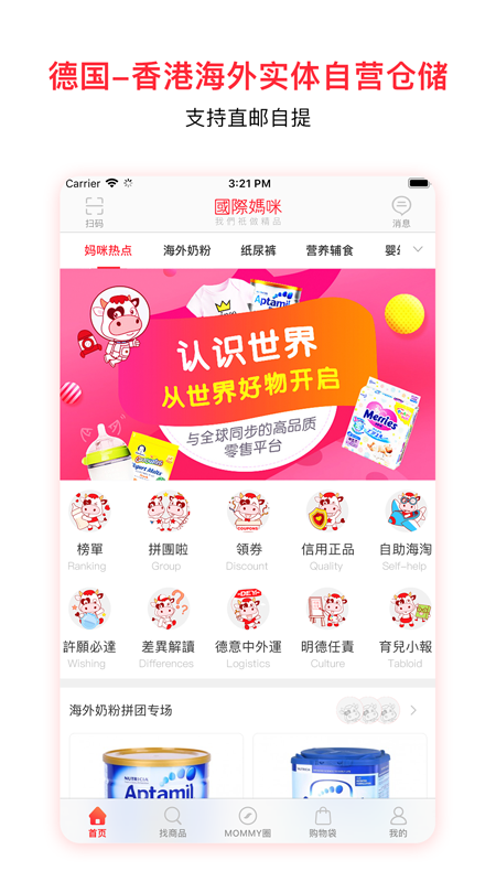 【海淘母婴限时特卖】国际妈咪全球各国设有仓储中心,海外发货量较大,有自己的国际物流优势,每天推出全球各国海外本地的优惠,用户只需国际妈咪APP浏览即可,无需传统海淘购物网的繁琐,国际妈咪海淘直邮国际运费只需25元人民币,海淘奶粉类商品全部免国际直邮费用。