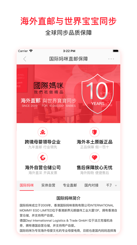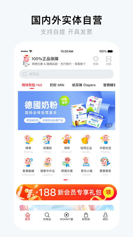 国际妈咪驻扎欧洲及香港,搜罗全世界优质的宝宝用品,并通过自身独特设计的APP平台,简单、精致的展示给用户。用户有多种国际直邮配送选择:自贸仓、德意中外运、万国邮政等等。国际线路报关透明,给用户提供了极大的品质安全保障。国际妈咪企业非常重视信用及品牌文化的建设,用户认可度即是对国际妈咪的信任。