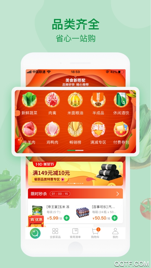 新鲜果蔬、禽蛋肉类、水产冻货、米面粮油、酒水饮料、调料餐厨…