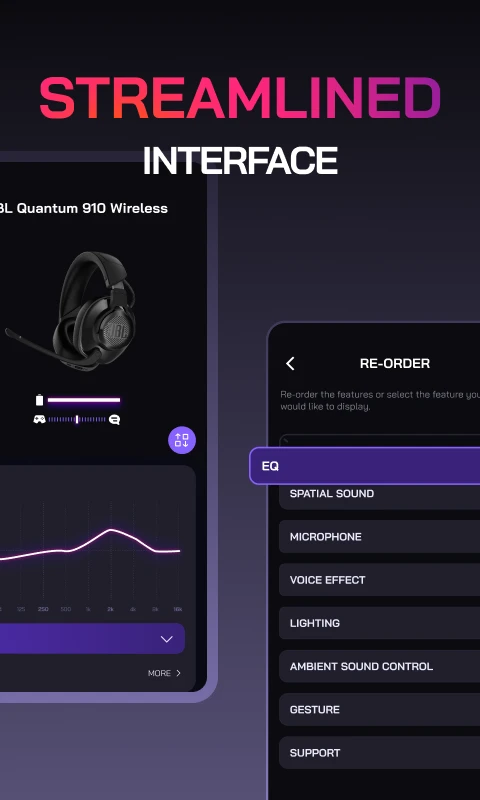 JBLQuantumapp是JBL量子系列耳机专属定制工具,搭载QuantumSpatial空间音效技术,精准定位声音方向,搭配游戏专属EQ调节与自定义预设。支持RGB灯光效果调校、耳机按键个性化设置,可同步用户音效配置文件,还能更新设备固件。