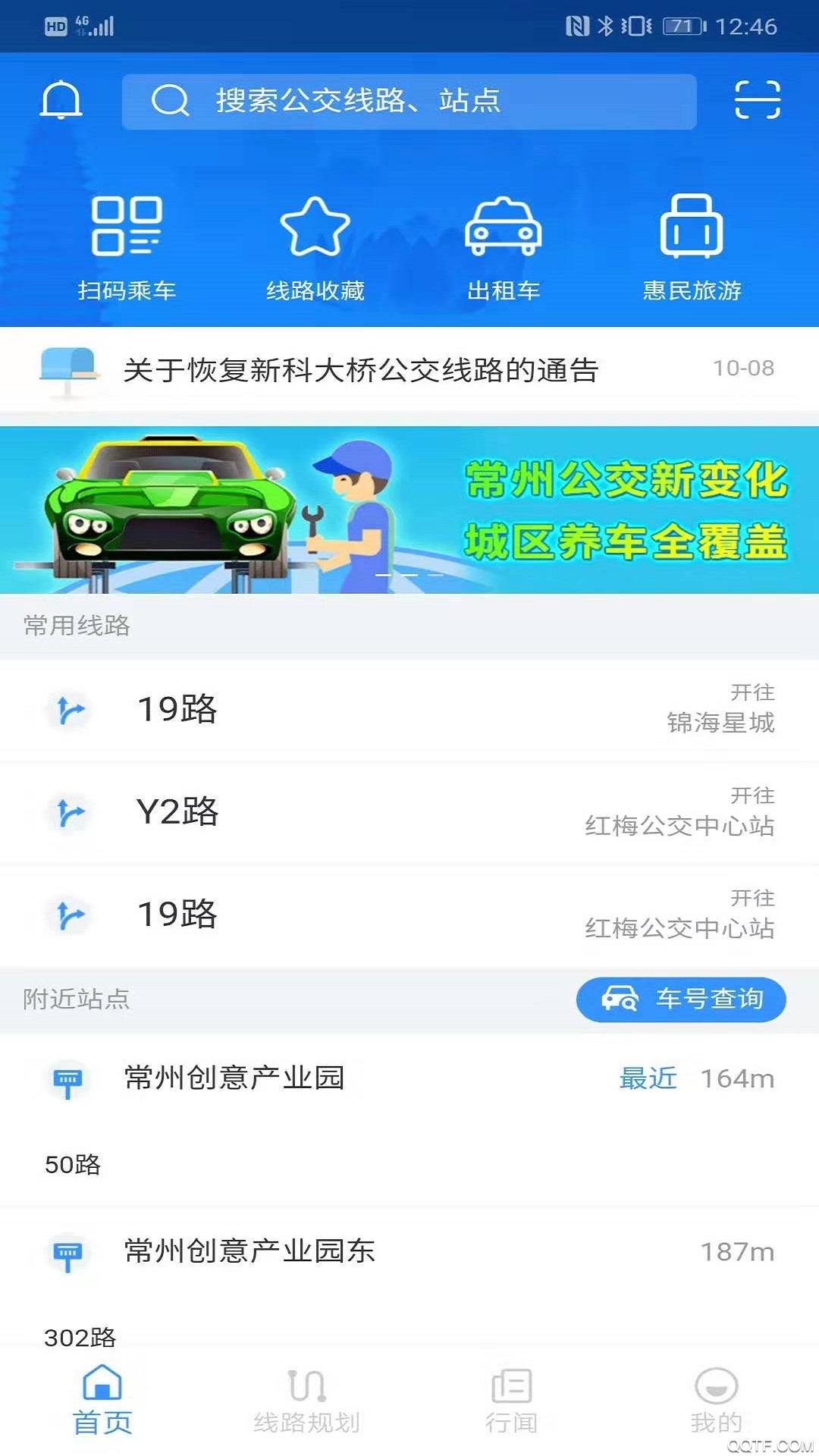 进入“常州行”APP,看到下方有“线路规划”选择当前位置→目的地。