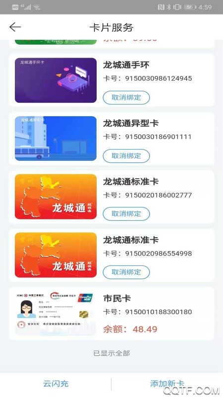 点击单张卡片,可以实现该公交卡的充值/查询/口头挂失功能。