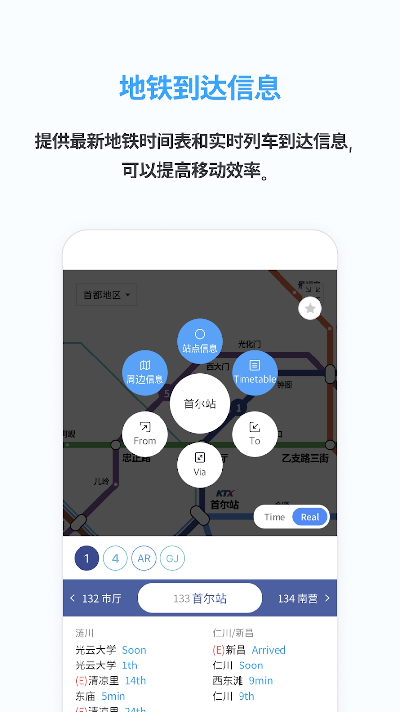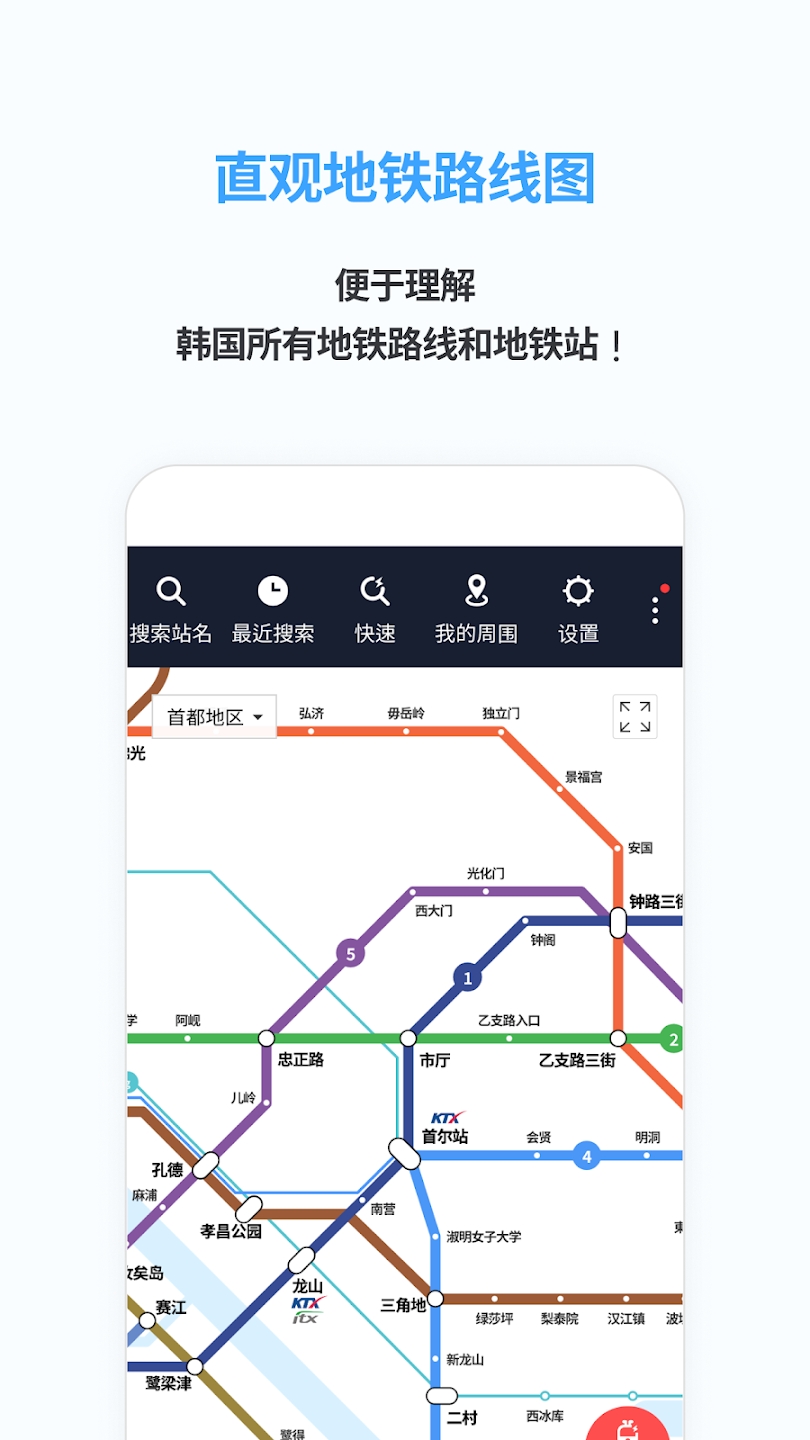 - 提供首都圈、釜山、大邱、光州、大田地区的最新地铁信息