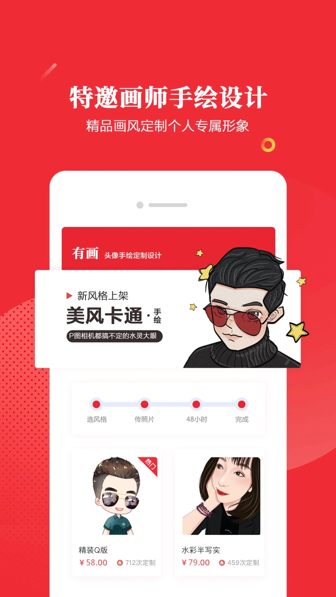 有画app是一款好用的头像定制软件,签约画师为你设计绘制专属形象,多重风格任你选择,展现独一无二个性化的你,在线下单限时完成,头像适用于所有场景无论是微信.QQ.抖音等各种平台均可,纯手工绘制卡通头像制作.卡通人物等,绝对人工手绘保证原创。均可保证原创,但若您商用所产生的纠纷不代表本软件的立场,如您有商用需求可另联系我们;