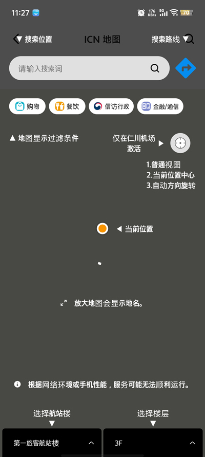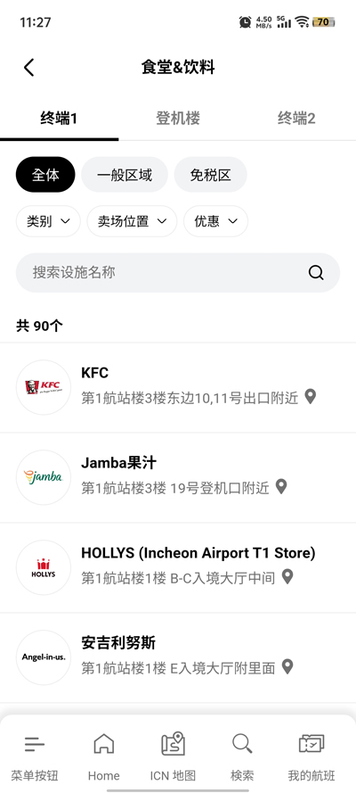 提供仁川机场所有航站楼的室内地图,包括详细的楼层布局、设施位置等。