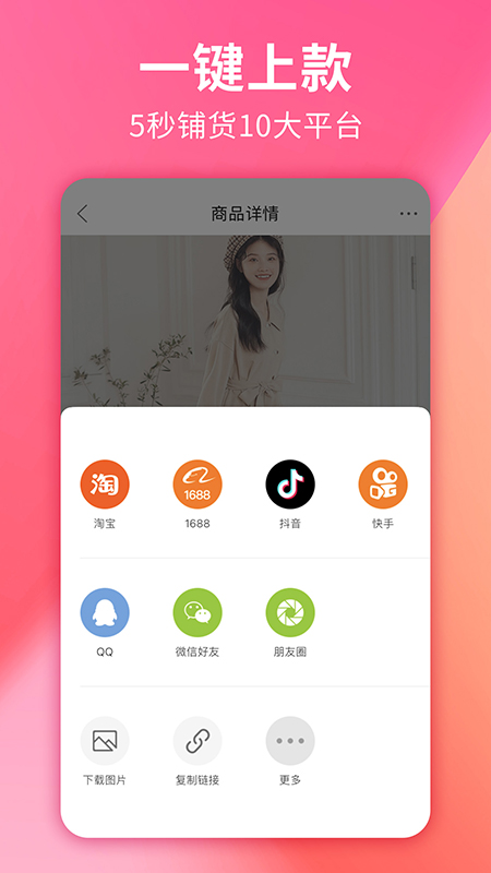 只要你看中,就能上架卖。商品图、视频及商品详情信息都能一键上传到淘宝、天猫、1688、蘑菇街、拼多多、微信、抖音、快手等平台。再也不用自己到处找图抠图啦。