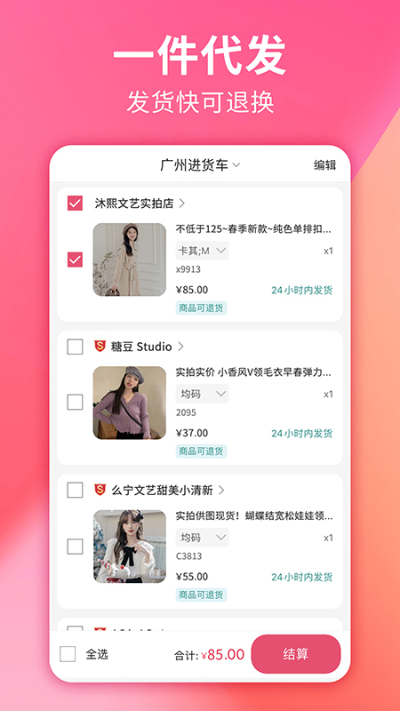 每天同步上新2万+源头批发商的新款,紧跟流行趋势,更有资深买手组货选款,凭借丰富经验和时尚嗅觉,找到性价比更高,顾客喜欢的款式,让你卖得起价,卖得更好。