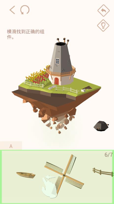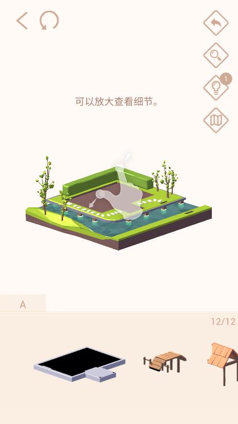 当然也有一些不足:有的零件必须要特定的角度才能放上去,比如一个圆,运气不好的话要试三次才能安上,很不方便,希望改进;然后是要关闭放大才能安装,很累眼睛,要是能在放大的情况下安装就好了;还有一点是,屋里有一些小部件容易被忽视,尤其是被屋檐遮挡的地方,希望能出一个自由调节角度模式,仅作为观察模式也行啊。