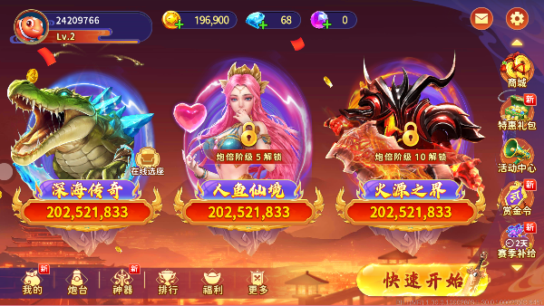 海王捕鱼手游支持多人实时联机,千炮竞技、BOSS挑战、秘境探宝等丰富模式任你畅玩,更有酷炫炮台、灵宠助战、赛季排行等特色系统,助你畅游深海,一网打尽海量金币与稀有道具。