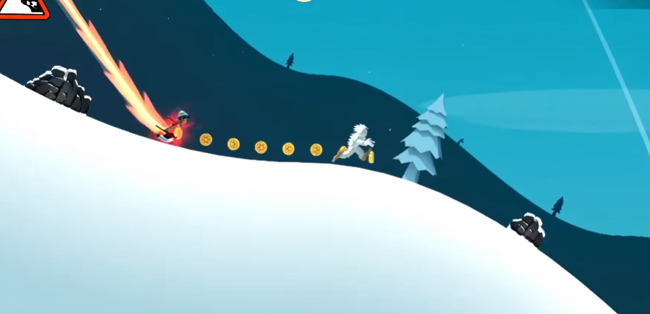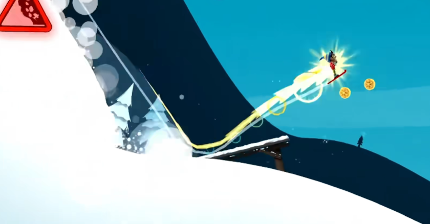3.屏幕左上方的雪崩警示牌会在危险临近时不断闪烁,哪怕你已看到身后滚滚而来的雪浪,只要迅速起身滑行,仍有机会绝地逃生!