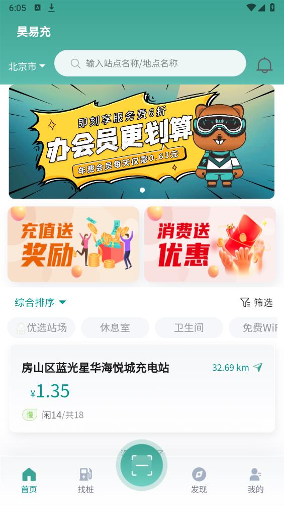 昊易充充电桩app最新版软件提供寻找充电桩的功能,可以根据场合选择,包括优选站场、休息室、卫生间等,还有首页的充电桩推荐,用处可以查看充电桩的距离,选择合适的充电桩,还可以进行筛选和查询,在个人信息界面,用户可以查看我的订单等。