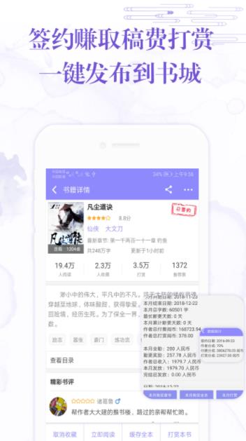 3、支持一键发布小说到书城、支持定时发布新章节,让千万读者阅读您的小说。可以和读者交流互动,可以得到读者的打赏和礼物。符合签约条件的小说可以直接和我们签约,赚取稿费