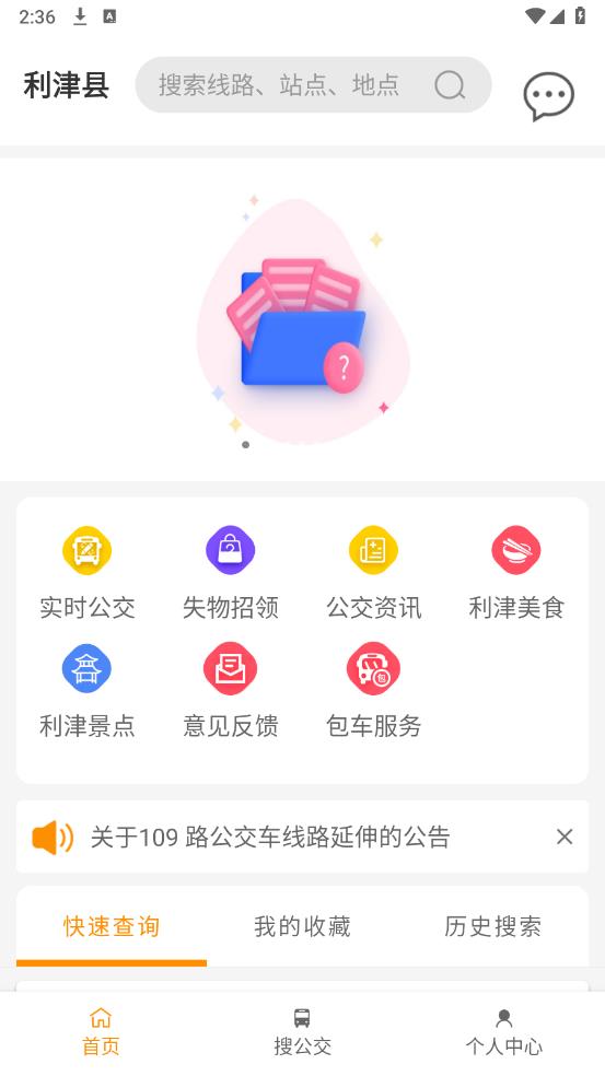 利津智慧公交app安卓版有各种公交出行的功能,包括实时公交、失物招领、公交资讯等,还有相关公告,以及快速查询、我的收藏、历史搜索等主要功能,用户可以在搜公交界面进行线路查询、换程查询、站点查询,以及个人中心界面的各种信息。
