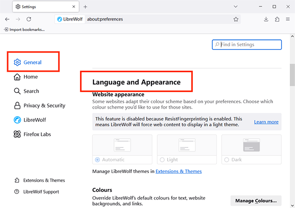 2、在“General”一栏中下滑至“Language and Appearance”部分。