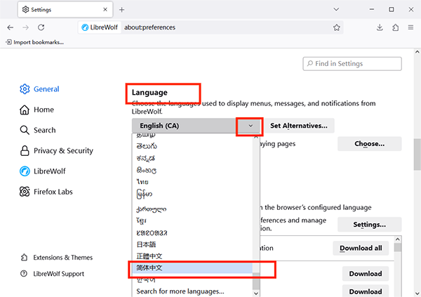 3、再下滑至“Language”部分,选择简体中文即可切换。