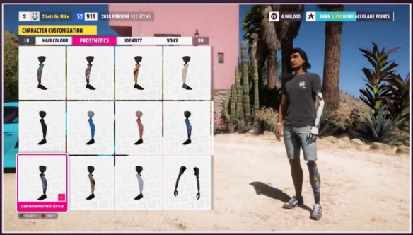 在极限竞速地平线5中,玩家在创建角色的过程中可以选择义肢,双臂和双腿共有33种义肢可供玩家选择。