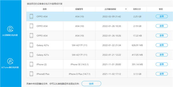 单击还原按钮后,程序将显示此计算机上的所有 Android 备份文件。选择您需要的备份文件,然后单击它旁边的查看。