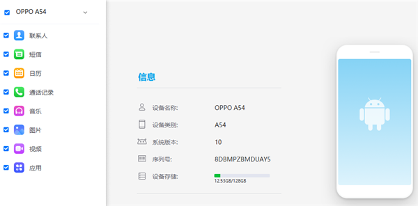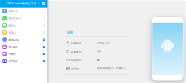 连接安卓手机后,选择要备份的文件类型。默认情况下,万兴手机管家已为您检查所有文件类型。然后单击备份以开始备份过程。