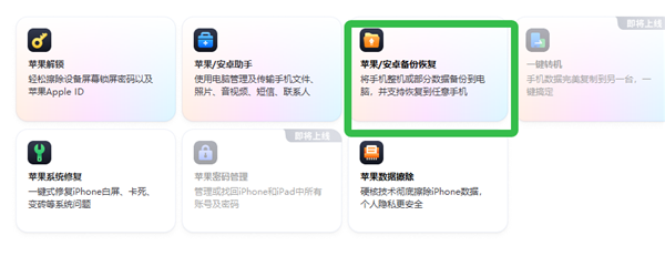 在您的计算机上启动万兴手机管家,在所有功能中选择“苹果/安卓备份恢复”。