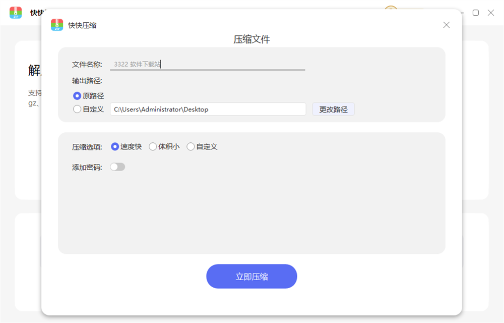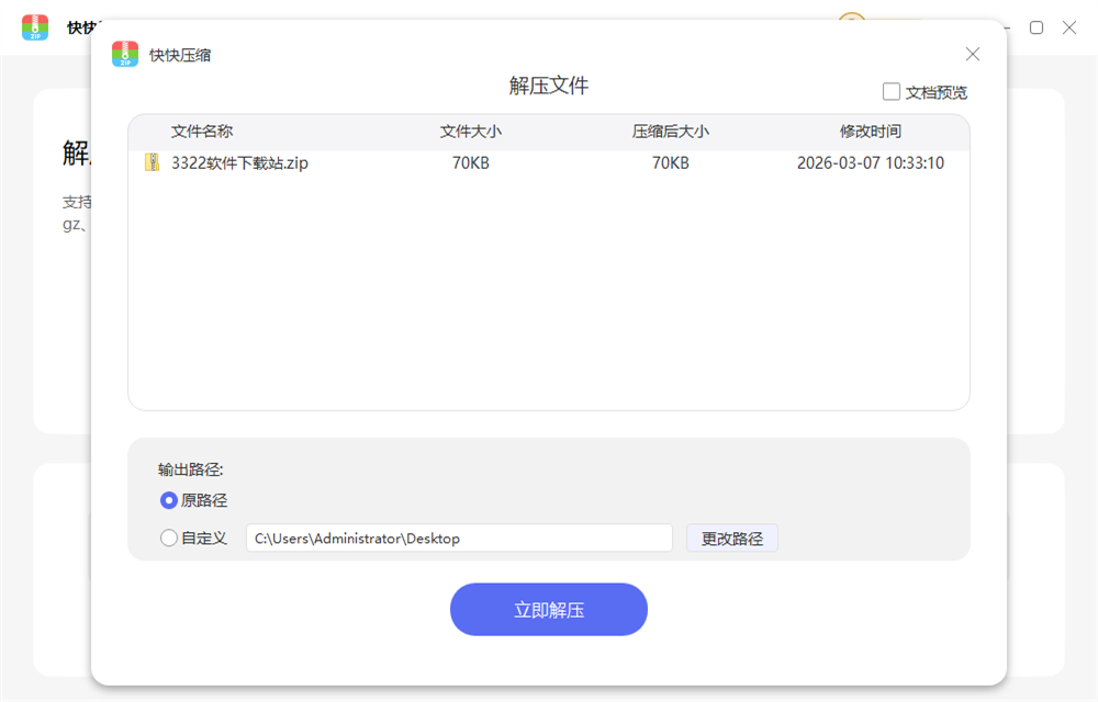 快快压缩是一款高效轻量的国产压缩解压工具,采用自主研发压缩引擎,在保证文件完整的前提下大幅提升压缩率,有效节省存储空间与传输时间。快快压缩软件全面支持 ZIP、RAR、7Z、ISO、TAR 等主流压缩格式,一站式满足解压与压缩需求,无需切换多款工具。同时通过多线程技术优化,大幅提升大文件解压与批量处理速度,还内置图片、视频、音频、Word、PPT、Excel、PDF 等专项压缩功能,操作简单、界面清爽、性能稳定,是办公、学习、日常文件管理中高效实用的压缩解压助手,欢迎下载使用!