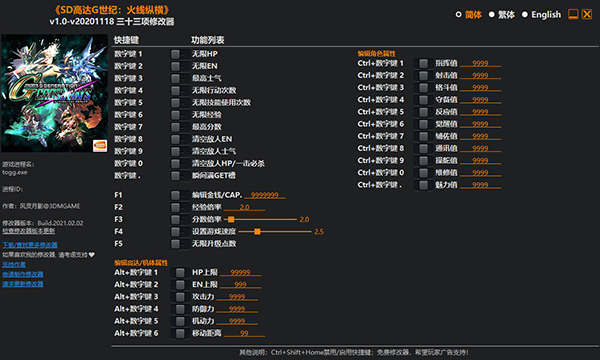SD高达G世纪火线纵横修改器是一款专为机战射击游戏《SD高达G世纪火线纵横》所打造的多功能修改器,具有无限HP、无限EN、无限行动次数、无限技能使用次数、无限经验、清空敌人EN等等在内的高达三十三项修改功能,可帮助新手玩家更好的上手游戏,且修改器简单易用,玩家只需启动游戏、开启修改器即可进行修改。