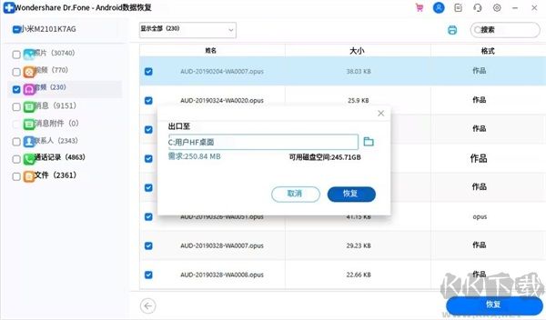 如果您想从安卓系统中恢复数据,请点击 恢复 在选择所有适当的文件类型后,右下角的按钮.继续设置回收数据的位置,然后 恢复 在弹出器上执行过程;