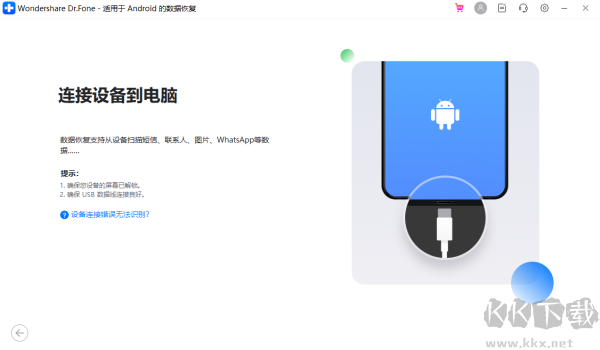 系统将提示您连接 Android 设备以从中恢复数据。用USB线连接并让平台检测到它;
