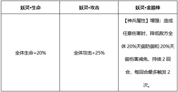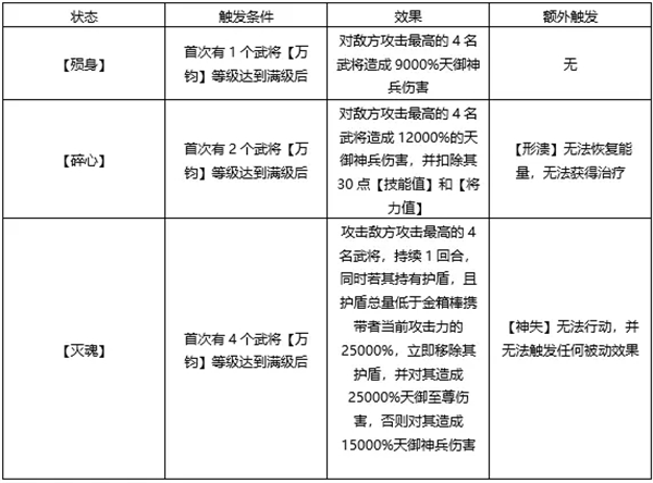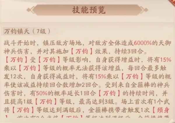 战斗开始时,镇压敌方场地,对敌方全体造成6000%的天御神兵伤害,并对其施加【万钧】效果,持续3回合。【万钧】受【万钧】等级影响,自身获得增益时,将有15%乘以【万钧】等级的概率无法获得该增益,每回合最多触发12次,自身获得减益时,将有15%乘以【万钧】等级的概率使该减益持续回合数增加2回合。受到来自金箍棒的神兵伤害时,有50%的概率延长1回合【万钧】的持续时间,并且提高1级【万钧】等级,最高达到3级。场上首次有1个武将【万钧】等级达到满级后,金箍棒携带者触发1次【殒身】。首次有2个武将【万钧】等级达到满级后,金箍棒携带者触发1次【碎心】。首次有4个武将【万钧】等级达到满级后,金箍棒携带者触发1次【灭魂】。