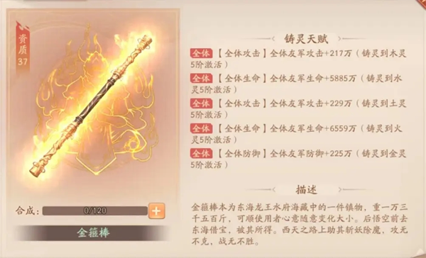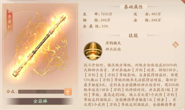 金箍棒,可定风可镇海,由定海神针化为的神兵利器。在资质上也达到37,也具有天金+的品质和标准。让我们来解读一下最新天金神兵的技能。