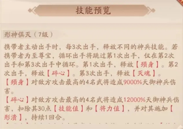 携带者主动出手时,每3次出手,释放不同的神兵技能。若携带者为至尊宝,循环出手将跳过第1次出手,仅在第2次出手和第3次出手中循环。第1次出手,释放【殒身】。第2次出手,释放【碎心】。第3次出手,释放【灭魂】。【殒身】对敌方攻击最高的4名武将造成9000%天御神兵伤【碎心】对敌方攻击最高的4名武将造成12000%天御神兵伤害,扣除其30点【技能值】和【将力值】,并对其施加【形溃】,持续1回合。