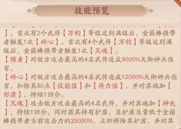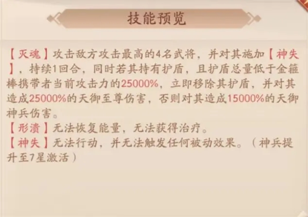 【灭魂】攻击敌方攻击最高的4名武将,并对其施加【神失】,持续1回合,同时若其持有护盾,且护盾总量低于金箱棒携带者当前攻击力的25000%,立即移除其护盾,并对其造成25000%的天御至尊伤害,否则对其造成15000%的天御神兵伤害。