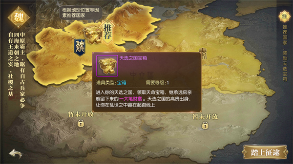 2、之后就可以选择自己喜欢的国家阵营加入,图示区域:国家选择,有宋、魏、唐、汉、秦、楚等10个国家。后续可以通过强弱国转国实现变更国家。