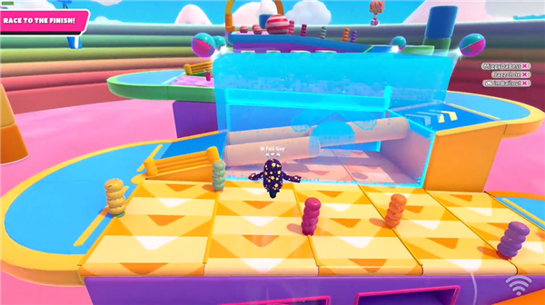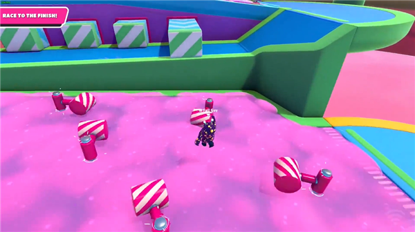 本地图分为八段障碍赛道。跑过三个障碍物后来到第一段推推赛道(也可从弹跳垫上弹上来但存在一定风险),找准时机通过。