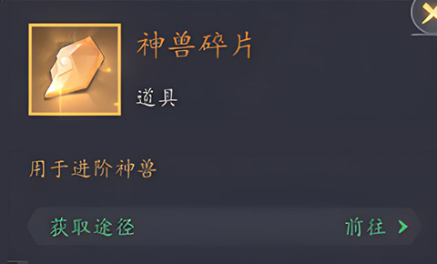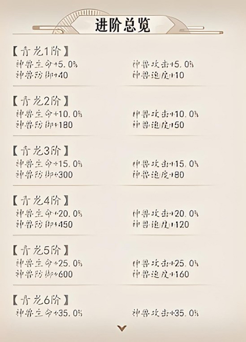 3、神兽每10级可进阶1次,进阶消耗相应系别英雄及神兽碎片,神兽碎片可以在神兽神殿对应的种族圣殿中通过或扫荡获得。进阶后额外提升神兽百分比属性