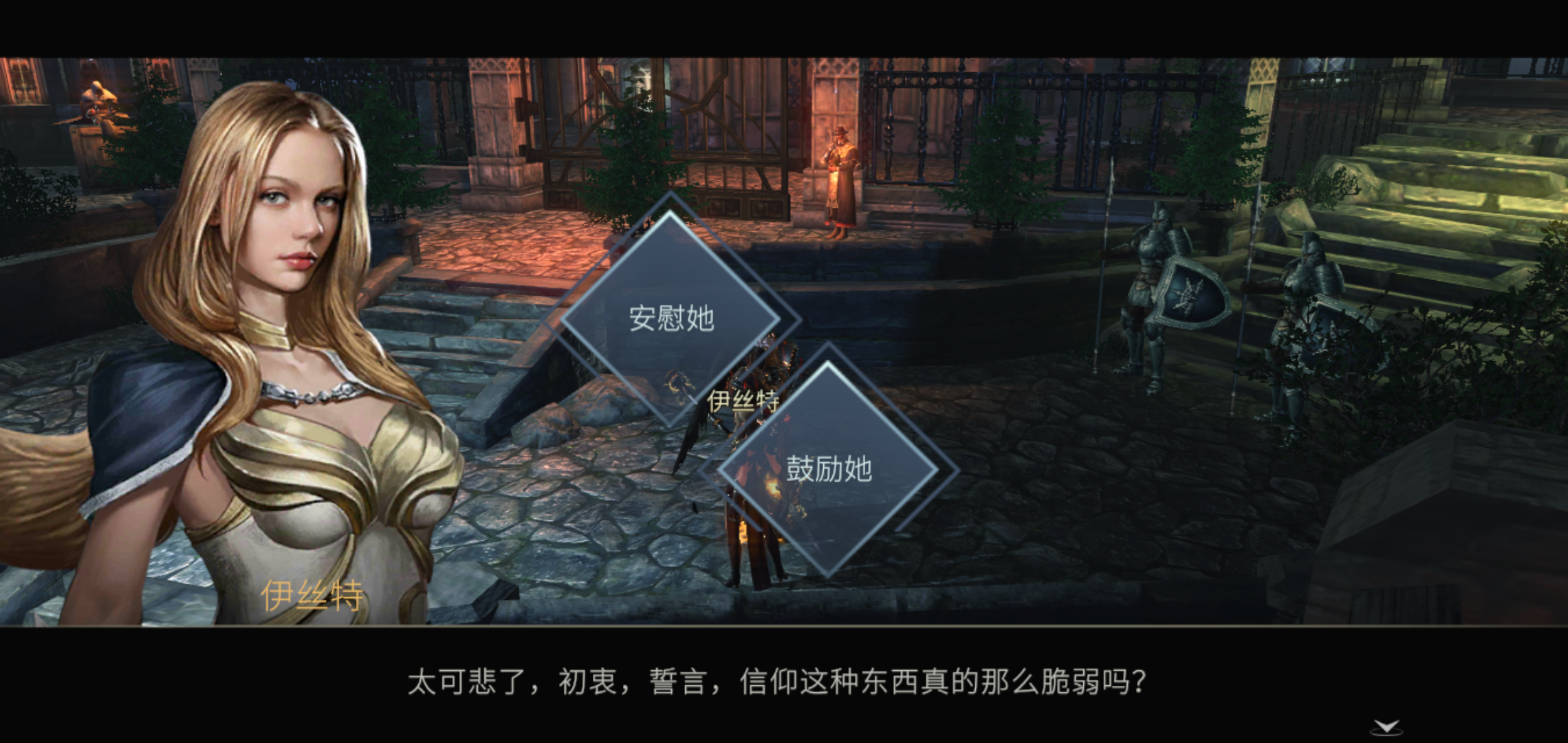 2-5左骑士,入场机关触发,走最右边通道。过关后回主城,找伊丝特聊天,选 不知道。