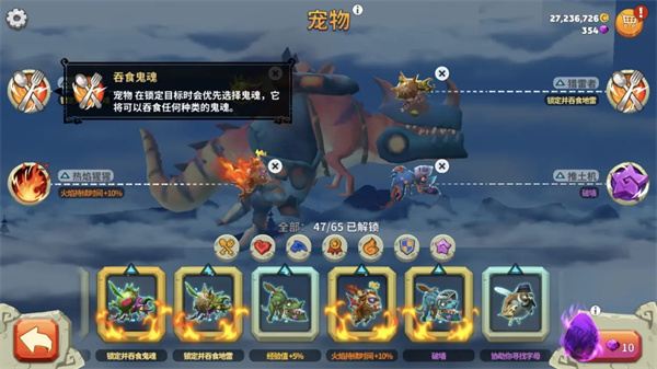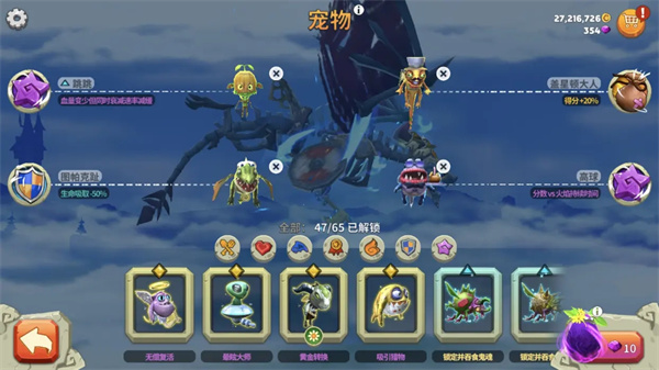 值得注意的是,明明图帕克趾可以减少流血效果,却还是普通宠物,而还带生命值减少的跳跳居然是稀有宠物,歪果仁的脑回路果然清奇,啊哈哈… 右侧的高球主要是为了增加烈焰奔腾的时间,一来可以获得n倍的得分,二来处于无敌状态,可以避免流血死亡并逃到怪物较多的地方。盖星顿大人和贪婪猩猩只是为了弥补其减少的得分,也是这个组合中容易被其他宠物替换的一只,毕竟即便得分减少,但存活时间非常长,总分也会变高,就是玩的时间要很长了。