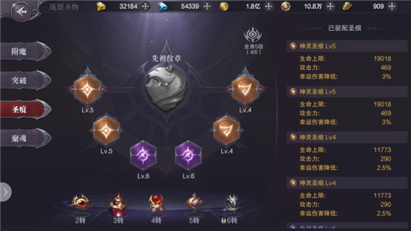 2转后开启圣物,激活圣物的材料需要大量战功,并在战盟中的战功商店兑换获得,附魔可以为勇士,增加基础属性,增加技能伤害、卓越伤害、伤害增加,但需要附魔等级达到要求逐步激活。