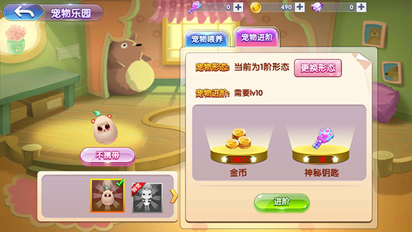 玩家可以通过培养使宠物成长,玩家的宠物长到一定的阶段就需要进阶,进阶后的宠物,就会拥有更加绚丽的外形,还可以获得金币、经验和亲密度的属性加成。