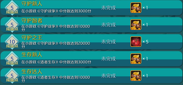 玩家在游戏内的守护战争、适者生存、穿越丛林、疯狂丢炸弹四个小游戏玩法内分数分别达到3000、10000、20000即可获得成就。