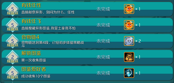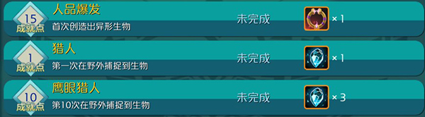 目前只有人品爆发、猎人、鹰眼猎人三个成就任务,首次创造异形、首次捕捉野外以及捕捉十次野外生物即可达成。