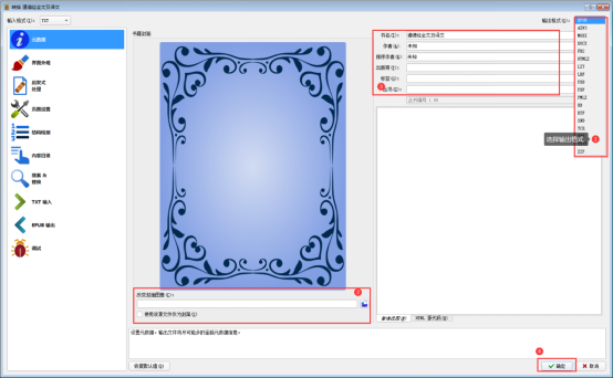 3、弹出转换界面,点击右上角输出格式后的文本选择框,选择需要的书籍格式,这里支持用户几乎所有能遇到的电子书格式,然后还可以对书籍封面和书籍名称等信息做一下修改,最后点击【确定】,这样软件就会对书籍进行转换。
