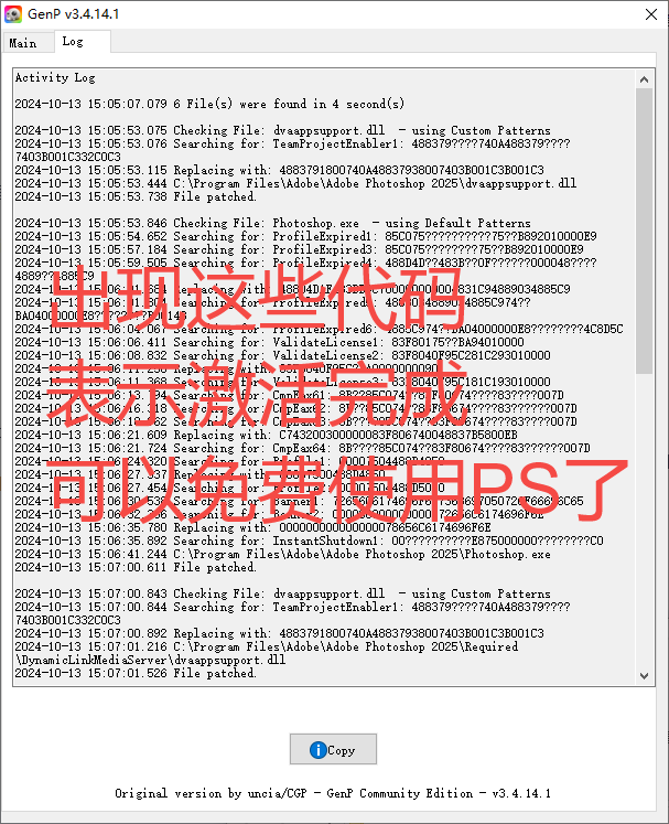 7、如下图所示,当出现这些代码代表激活完成,可以免费使用ps2025了。