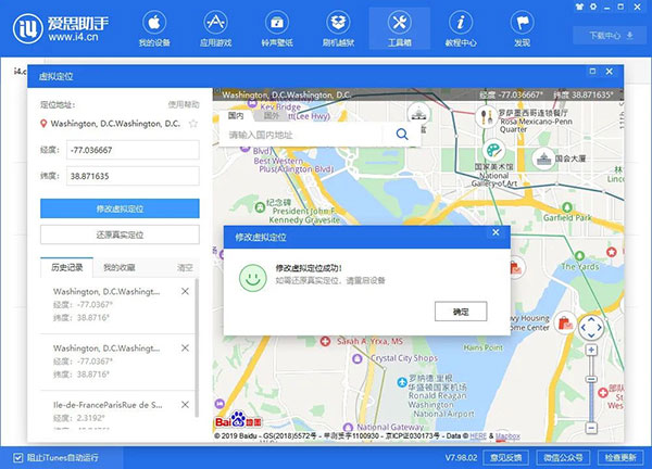 3、选择好虚拟定位后点击“修改虚拟定位”,出现“修改虚拟定位成功”弹窗表示完成。