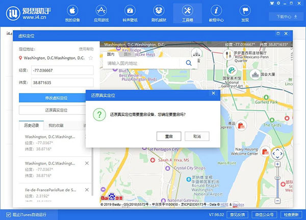 5、如需恢复正常定位,可以在爱思助手上点击“还原真实定位”按钮并“重启”设备。