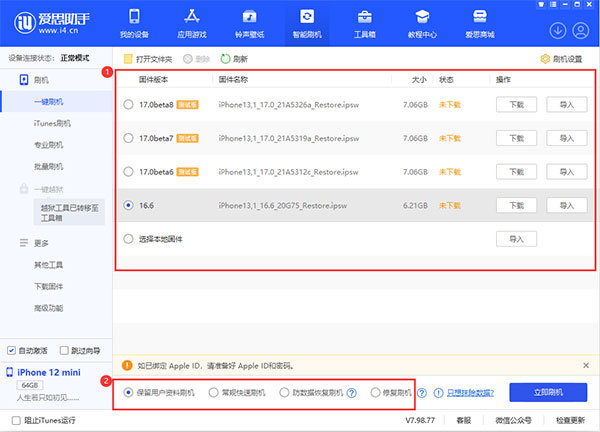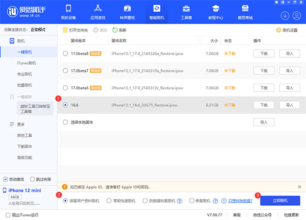 保留用户资料刷机:如果希望在刷机同时保留用户数据,请勾选此项。但由于苹果系统限制,降级操作时不可勾选,否则可能会导致刷机失败,数据丢失。