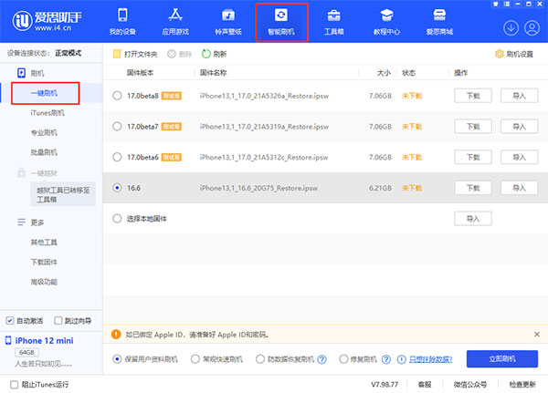1、刷机存在风险,为防止意外情况,在进行刷机操作之前,请提前备份好设备内的所有数据(爱思助手全备份)。